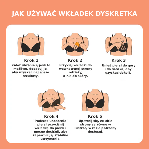 Przygotowanie jest kluczowe! Przed użyciem wkładek DYSKRETKA upewnij się, że piersi są czyste i suche. Makijaż, olejek, balsam lub inne produkty do pielęgnacji ciała mogą utrudniać prawidłowe przyleganie wkładek do skóry. Najpierw załóż ubranie, następnie umieść wkładki na ubraniu, a następnie unieś piersi i przyklej je do wkładek, aby je zabezpieczyć.